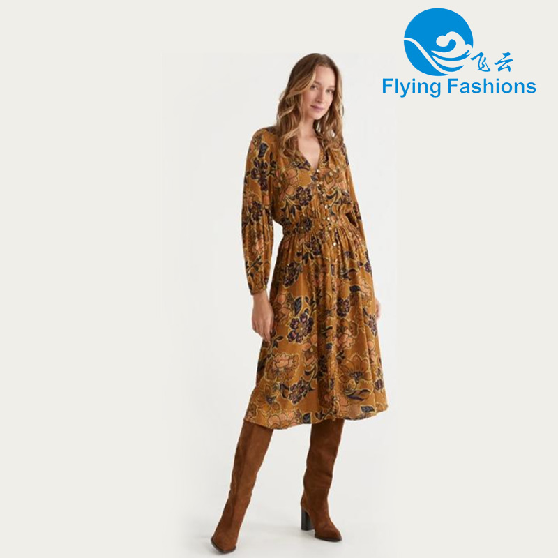 Product Introduction: Brownish-Yellow V-neck Floral Midi Dress by Flying Fashions