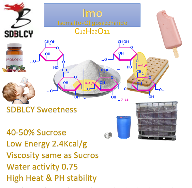 Organic Isomalto-oligosaccharide (IMO) 900 Powder** is a naturally occurring, moderately sweet carbohydrate that is found in small quantities in honey and fermented foods such as miso and soy sauce. It shares many beneficial properties with Oligofructose and Inulin, making it a popular choice for health-conscious consumers. IMO 900 is composed of glucose oligomers with alpha-(1-6)-linkages, including isomaltose, panose, isomaltotriose, and isomaltopentose. The majority of these oligosaccharides consist of 3-6 monosaccharide units, though disaccharides and longer polysaccharides (up to 9 units) are also present.