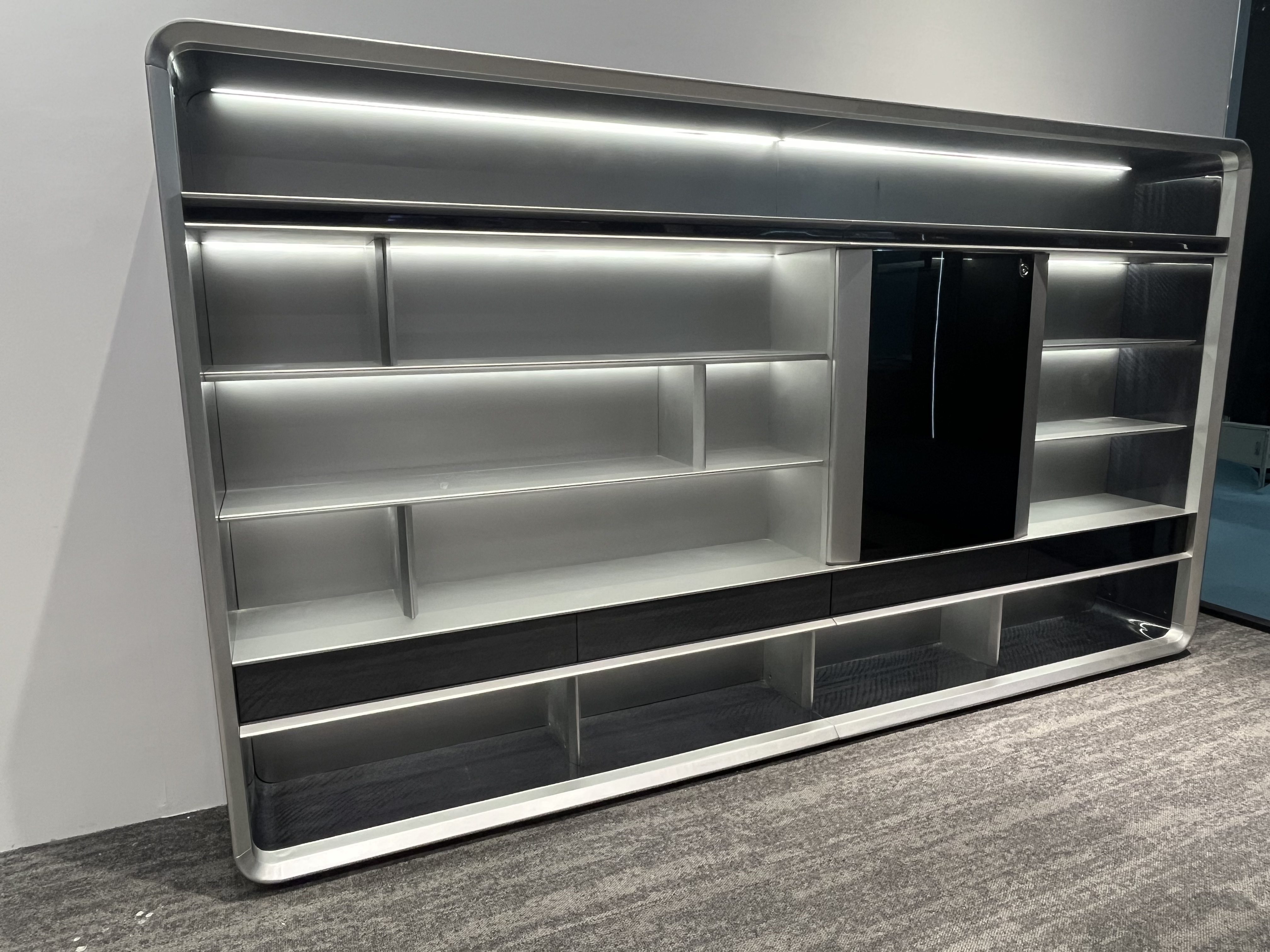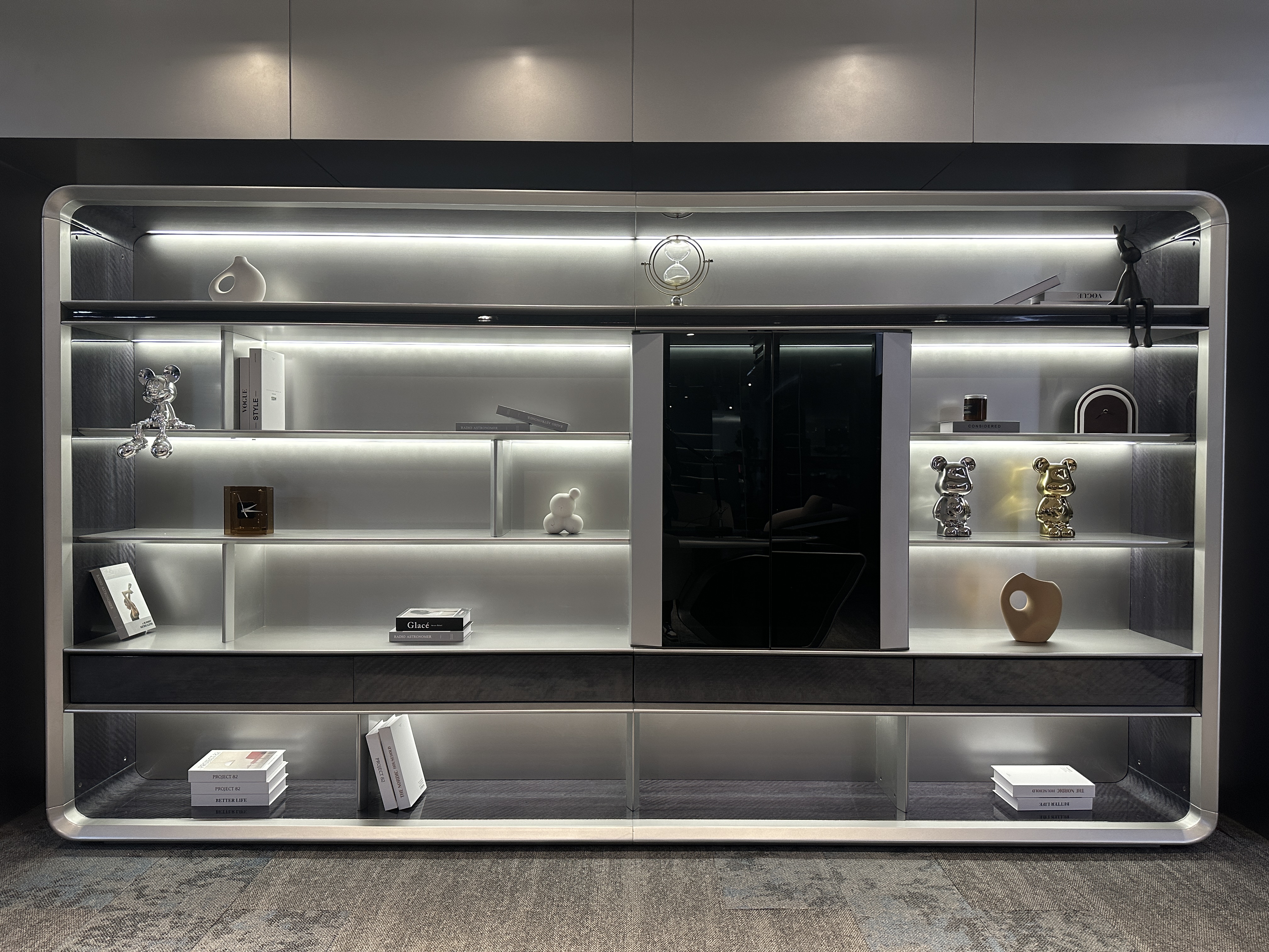 The spacious, streamlined shelves offer flexible layout options—arrange pieces to tell a cohesive brand story, highlight new arrivals, or showcase milestones—all while the cabinet’s minimalist, high-end silhouette blends seamlessly with upscale, modern backdrops.