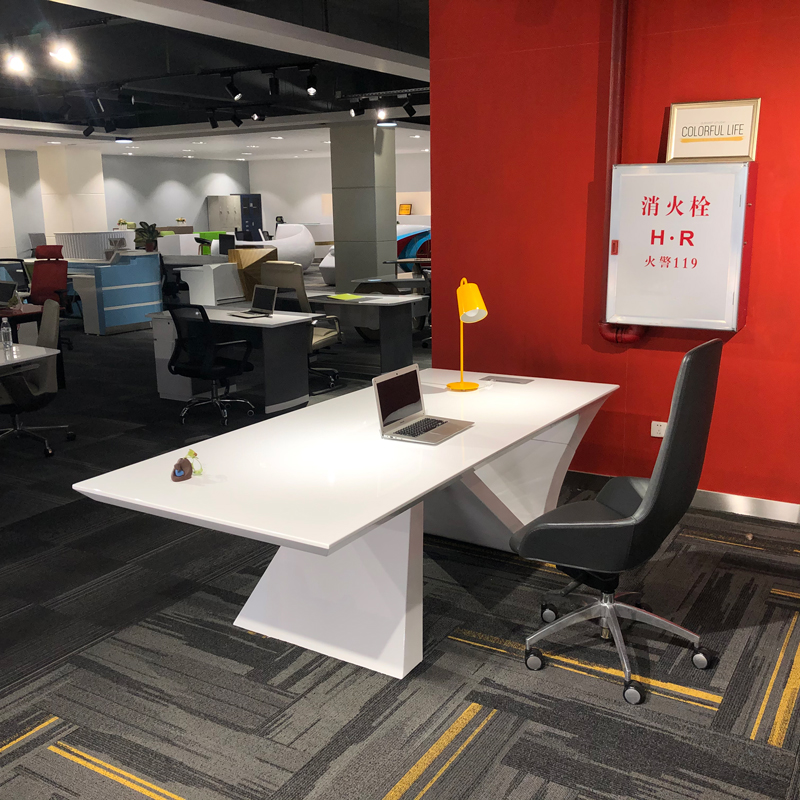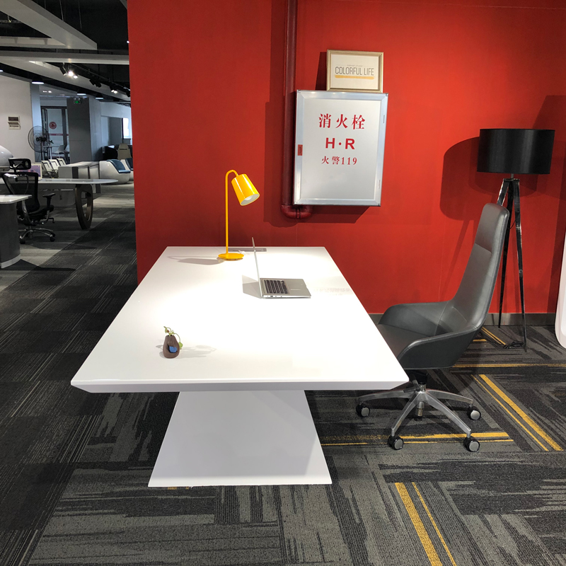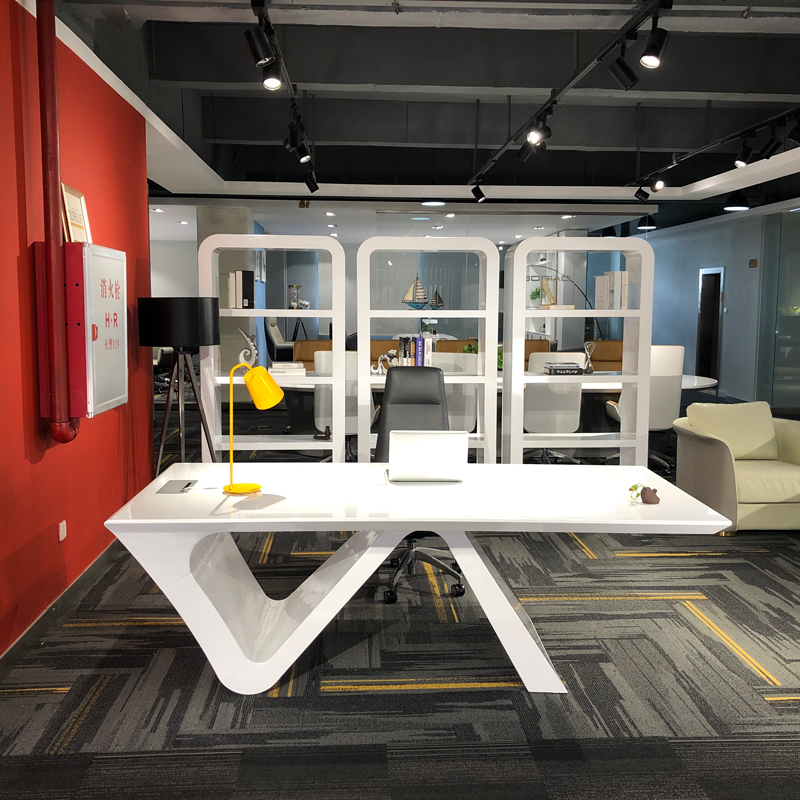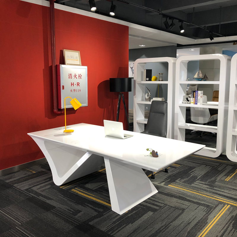 Its striking X-shaped white base doubles as a visual statement, infusing the area with sleek, modern flair while supporting a spacious, smooth tabletop: ideal for laying out creative sketches during impromptu brainstorming, setting down refreshments for client casual chats, or even serving as a flexible workspace for small-team quick syncs. The clean, light-toned finish blends seamlessly with bright, organized backdrops (like the open shelving and curated decor here), keeping the space uncluttered yet visually engaging.