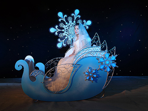 Suitable for various wedding styles, as a way of appearance, the bride rides on a snowflake carriage, accompanied by the special effect of white snowflakes flying in the sky, as if the kingdom of white snowflakes has sent her most noble princess. This product has no tracks, no power cords, and can be used continuously for 1-2 hours. The load-bearing capacity is about 100 kilograms.